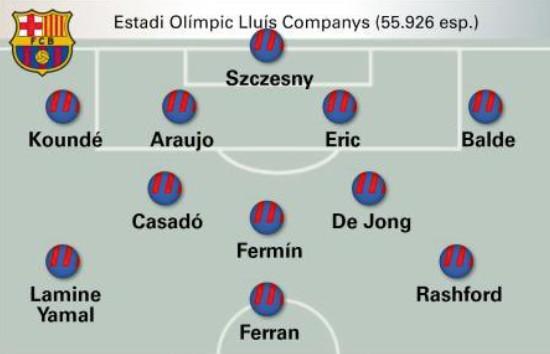 什琴斯尼;孔德、阿劳霍、埃里克-加西亚、阿莱士-巴尔德;卡萨多、弗朗基-德容、费尔明-洛佩斯;亚马尔、费兰-托雷斯、拉什福德